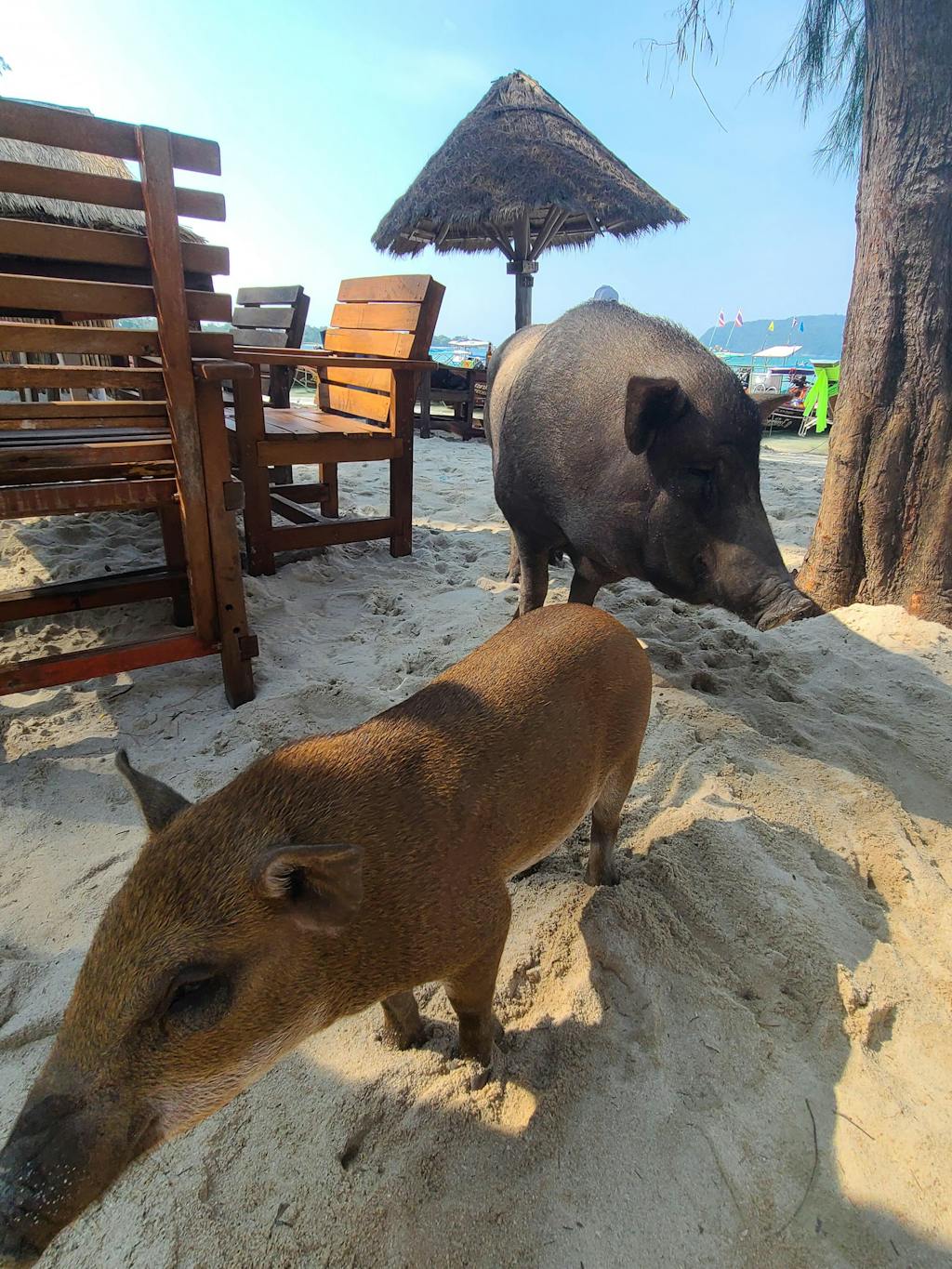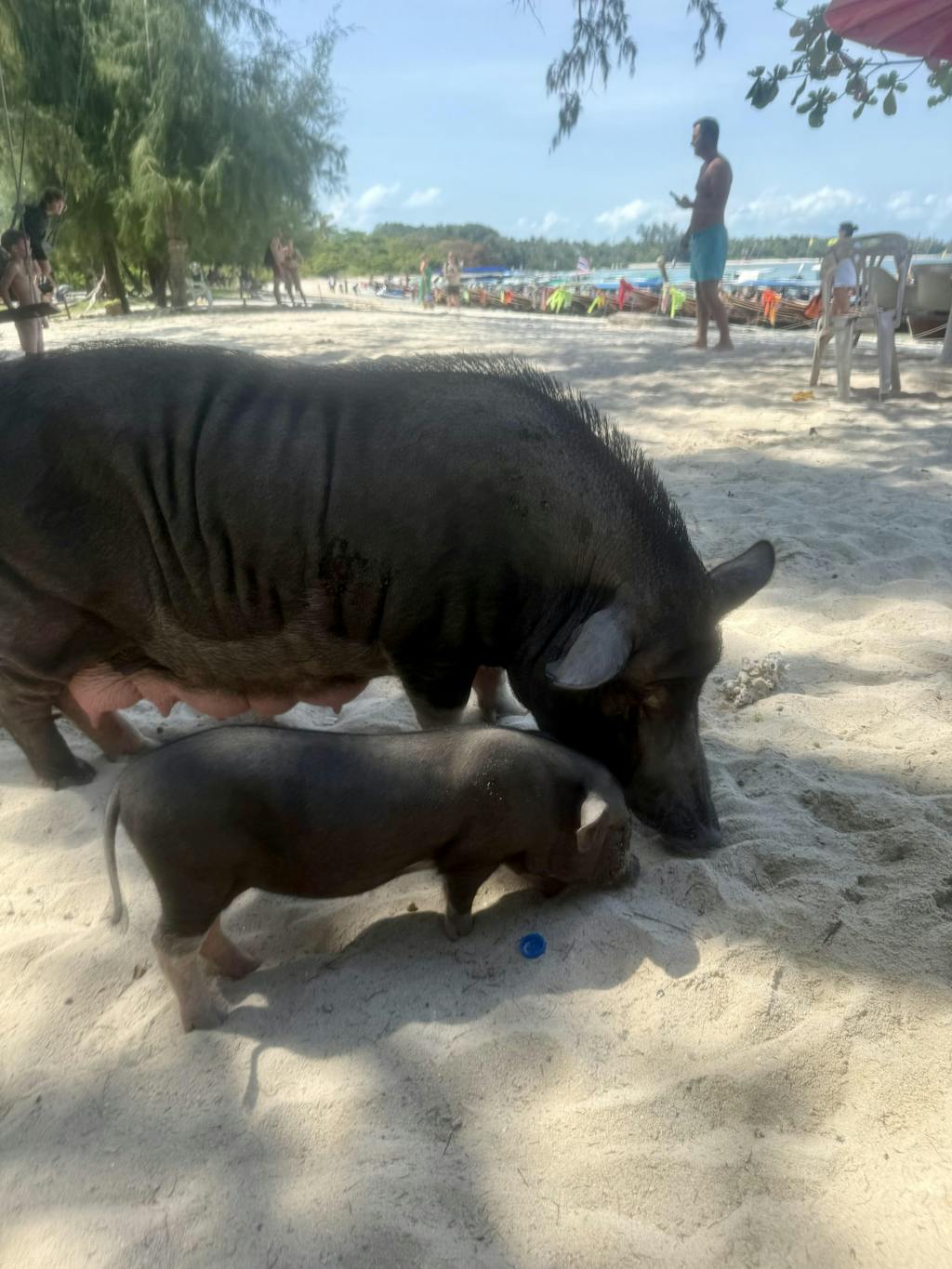 The 1st stop on our day trip is on the beautiful island of Koh Mudsum (Pig Island). A quaint little island, with white sandy beaches without civilization, electricity and running water. There is a small restaurant here and the highlight is woolen pigs like in the Bahamas, which make themselves comfortable on the beach.