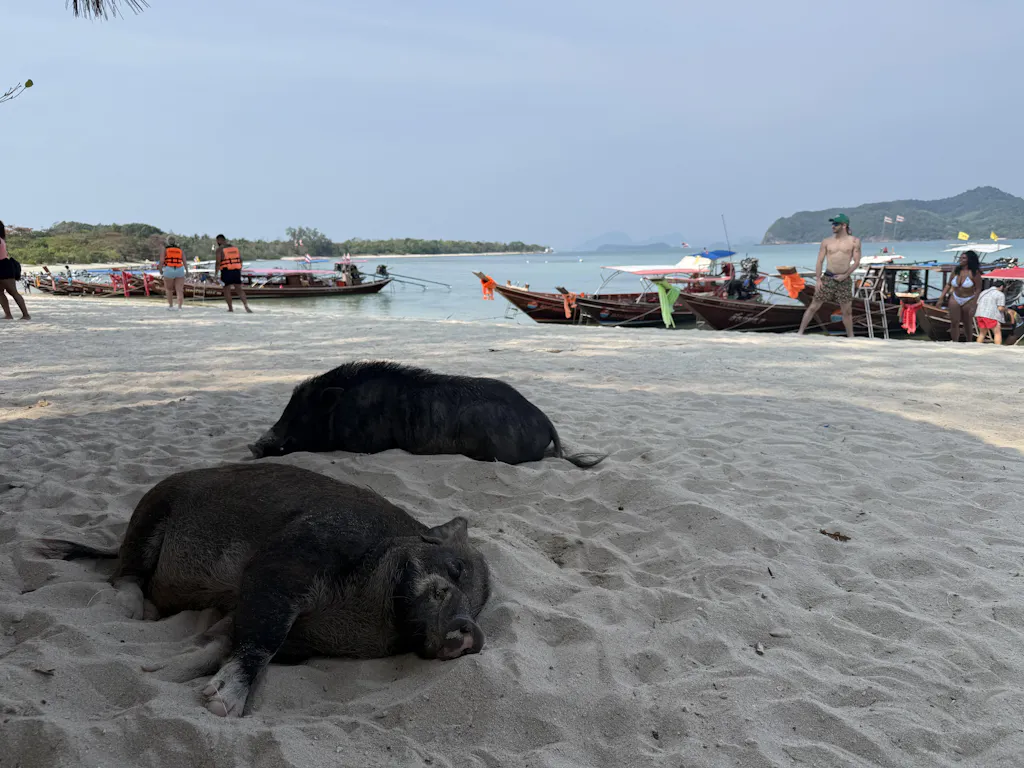 After a short crossing from Koh Tan, we reach the nearby neighboring island. Welcome to the beautiful island of Koh Mudsum. Here the world stands still because there is still no civilization, running water, or electricity. Amazingly, there are a few woolly pigs here on the white sand beach, like in the Bahamas. Enough time to relax or swim.