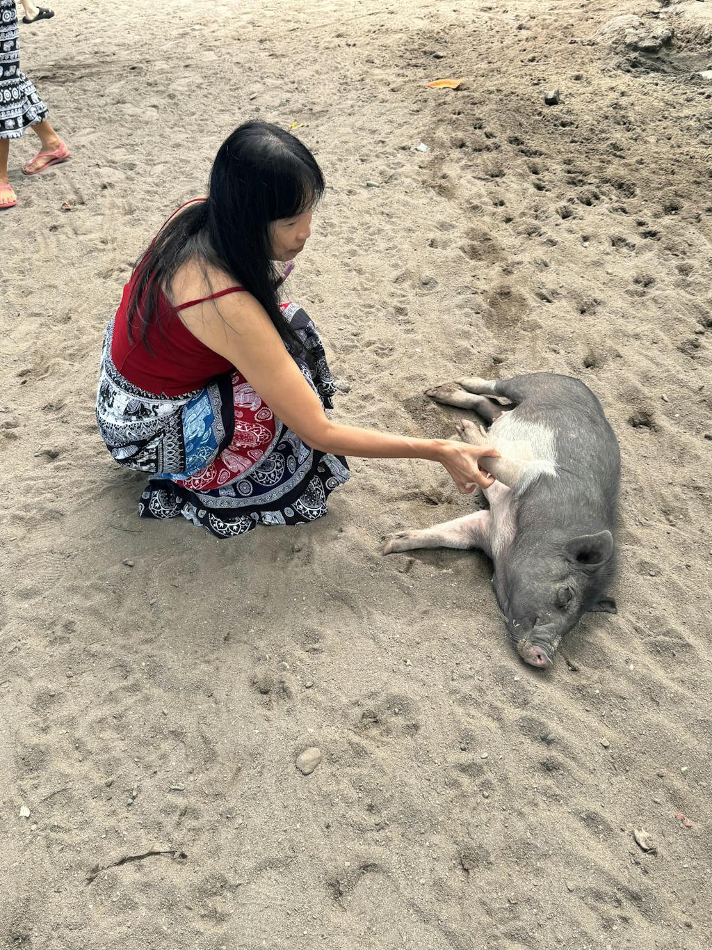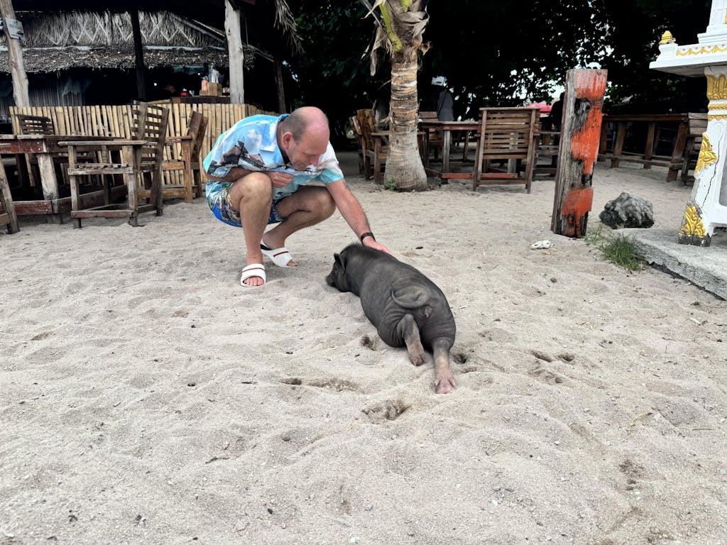 The first stop on our day trip is on the beautiful island of Koh Mudsum (Pig Island). A quaint little island, with white sandy beaches without civilization, electricity and running water. There is a small restaurant here and the highlight is woolen pigs like in the Bahamas, which make themselves comfortable on the beach.
